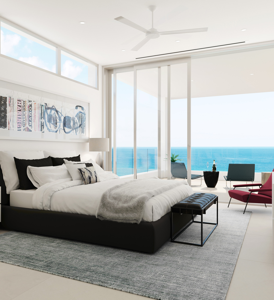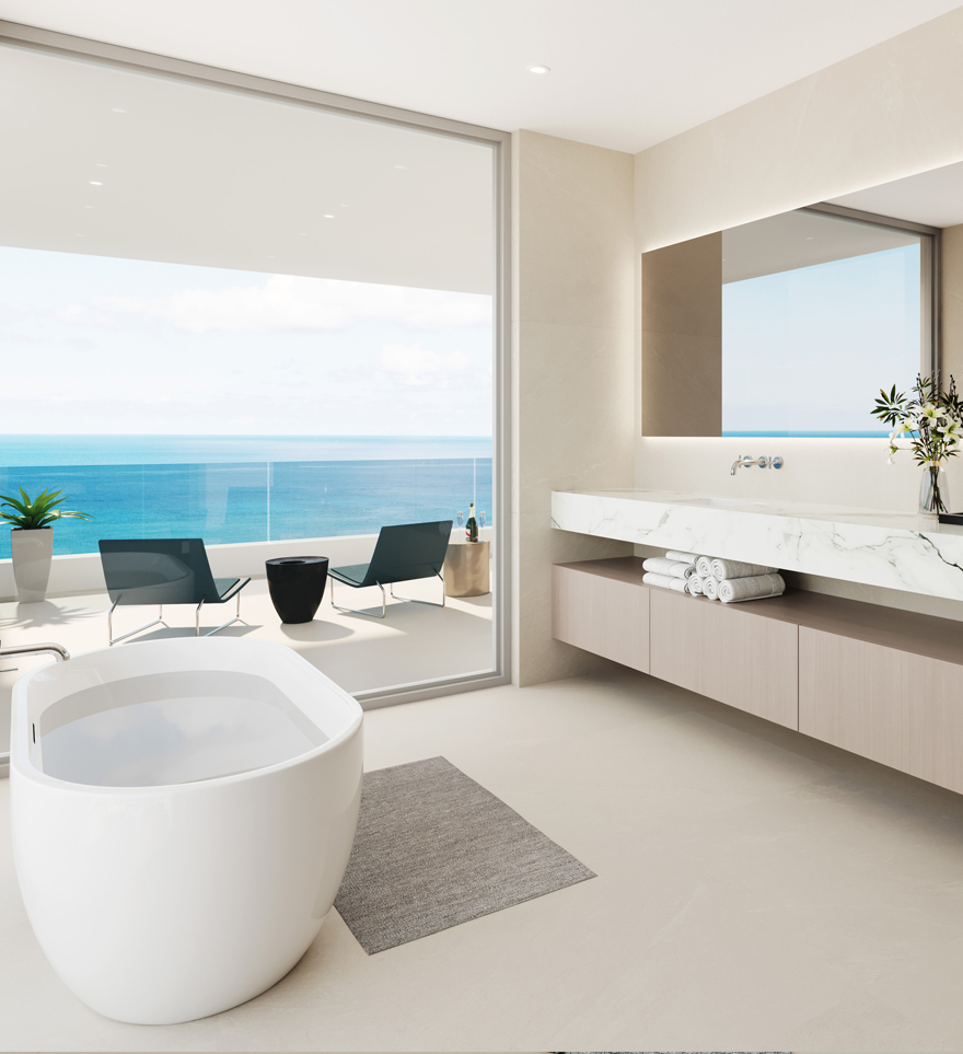 Filled with light and accented by luxe finishes, each bedroom offers bespoke custom cabinetry, setting a new standard for interiors on Seven Mile Beach. Crisp whites, stone textures and warm timber finishes adorn the bathrooms, bringing resort-inspired luxury to your daily routine.